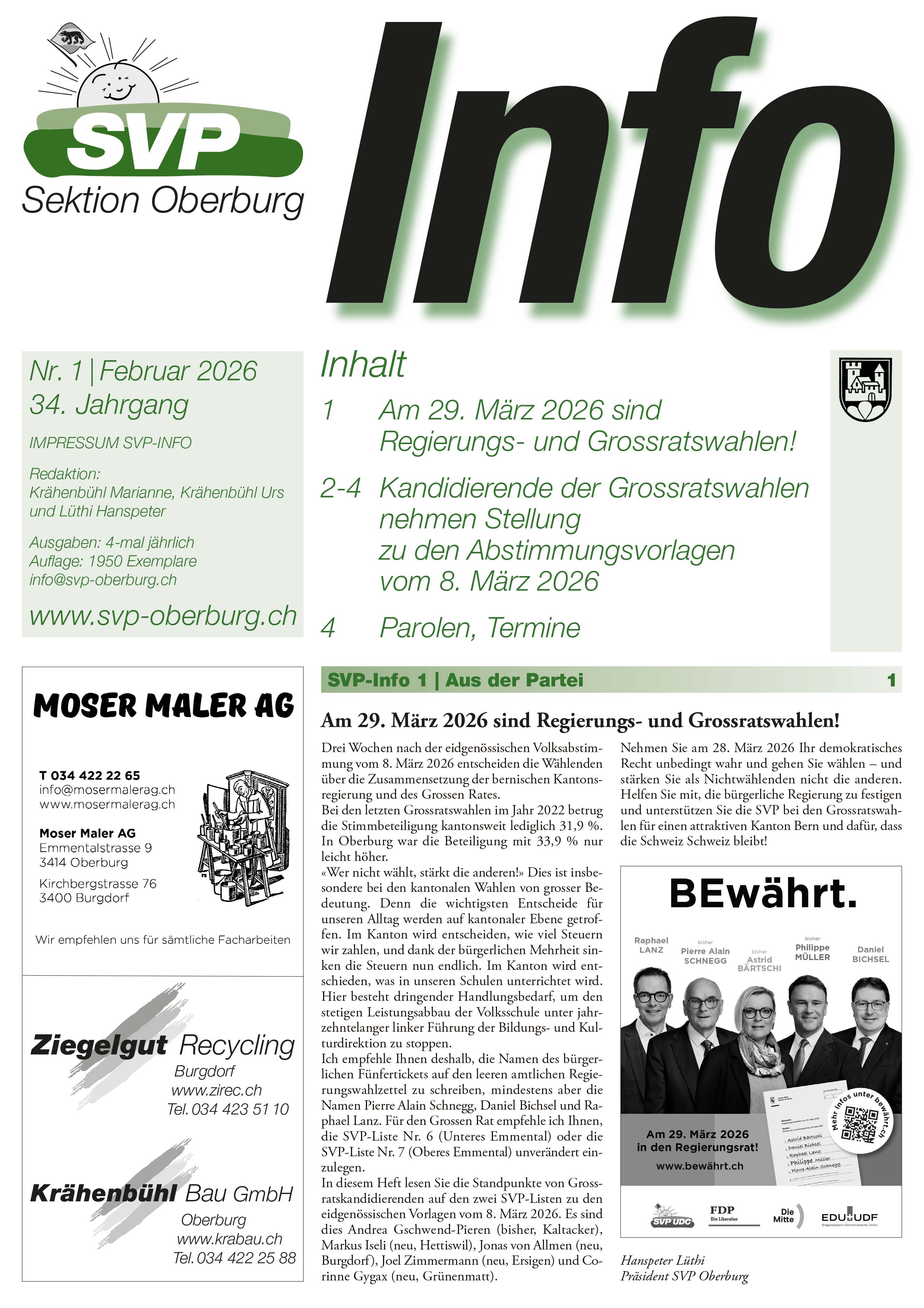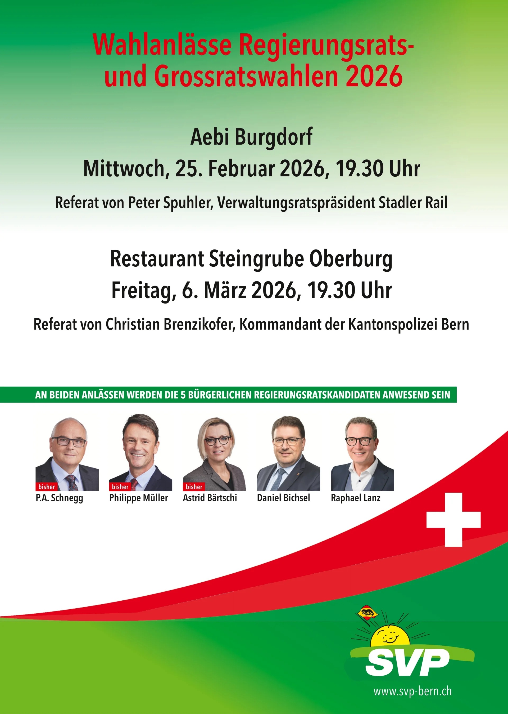 Die SVP Kanton Bern setzt sich dafür ein, Gutes und Bewährtes zu erhalten, aber auch Probleme anzusprechen und zu lösen: für eine blühende Zukunft unseres Kantons Bern und unserer Schweiz!